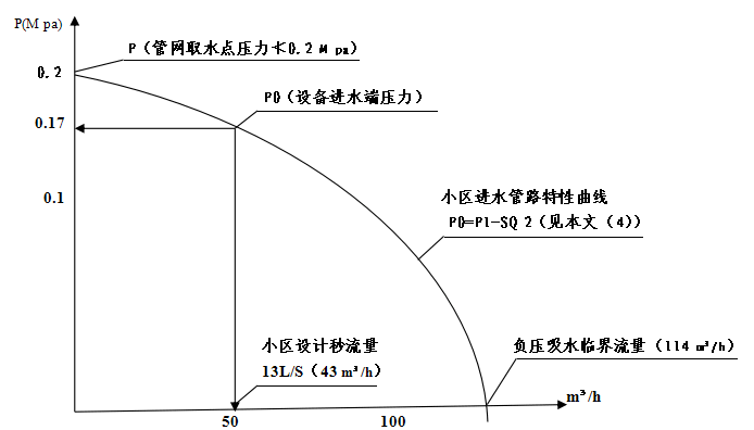 以圖1示例管路及數(shù)據(jù)繪制出曲線,可見到當滿足用戶所需最大流量13m/S時,進水口之壓力P0為0.17MPa。將此點作為水泵調(diào)速的流量控制點,控制水泵在運轉(zhuǎn)或事故等任何時候均不會超過控制流量出水,則根本不會產(chǎn)生負壓,而使管路水流保持連續(xù)流態(tài)。